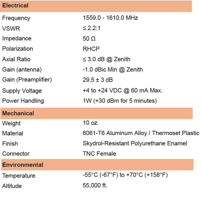 S67-1575-338: L1 GPS operating at 1575.42 MHz and GLONASS operating at 1601.00 MHz. Molded radome provides enhanced protection against rain, ice and lightning strikes. Application for airborne, marine, ground vehicles and manpack installation. The antenna features a state-of-the-art amplifier that uses advanced technologies to provide high GPS GLONASS signal levels with extremely low noise operation for fast satellite acquisition. The amplifier’s complex filtering network rejects adjacent/out of band signals that interfere with the GPS GLONASS operating frequency. The antenna is capable of operating with voltages between +4 to 24 VDC, due to the amplifier’s advanced voltage regulator.