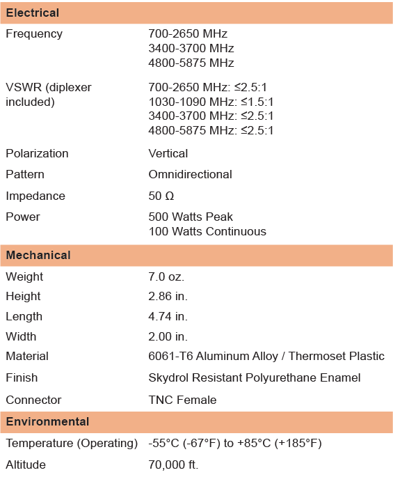 The S65-5366-720 antenna provides world-wide interoperability for data loading electronic flight bags, cargo loading manifests, HUMS (Health and Usage Monitoring System) offloads, updating in-flight entertainment systems and other data transfer functions.